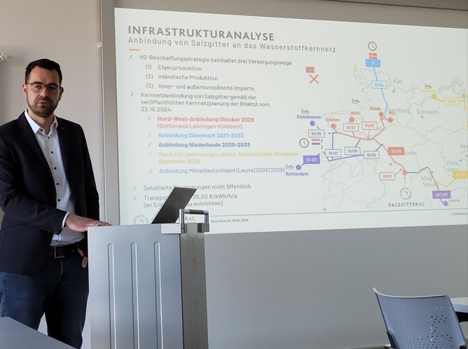 Im Vortrag wurde deutlich, dass der Aufbau einer leistungsfähigen Wasserstoffwirtschaft und die Lieferketten eine zentrale Voraussetzung für die Umsetzung solcher Industrieprojekte ist. Zu den aktuellen Herausforderungen zählen insbesondere die pragmatische Anpassung von regulatorischen Vorschriften an erneuerbaren Wasserstoff sowie die rechtzeitige Anbindung industrieller Großstandorte wie Salzgitter an das künftige Wasserstoff-Kernnetz. Auch Fragen der Energieversorgung, der Investitionssicherheit und der Genehmigungsverfahren spielen eine wichtige Rolle für den Erfolg der industriellen Transformation.